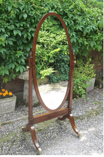 A regency mahogany cheval mirror in great condition. It sits firmly in its stand and tilts forward and back for maximum advantage. The mahogany stand has turned finials and arching splayed feet terminating in castors for ease of movement. Both the stand and the mirror are in good condition. This would look wonderful in any bedroom or bathroom.