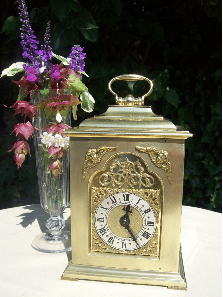 An interesting 8 day miniature brass Queen Anne style carriage/mantle clock with balance wheel escapement.