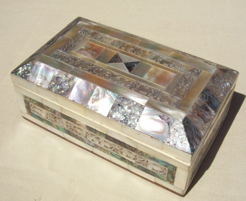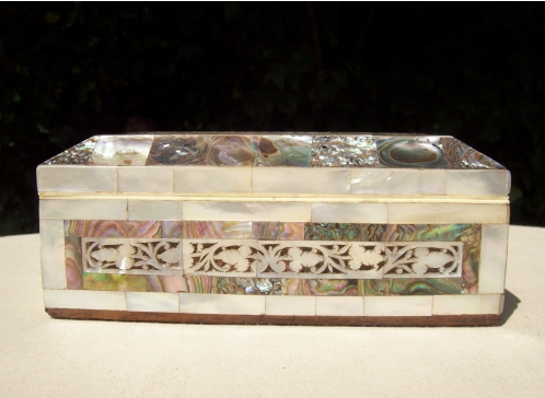 Here we have a Victorian mother of pearl jewel casket in excellent condition. The whole casket is decorated in mother of pearl and the top and front features mother of pearl fretwork. The inside is lined in a pale/baby blue material and is also in good condition.