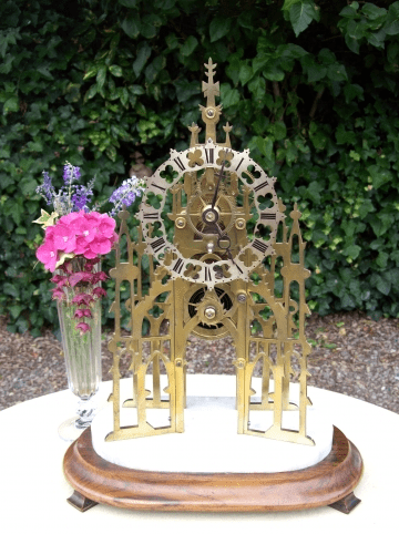 A rare 19th century 6 spoke wheel 8 day cathedral skeleton clock with silvered dial.