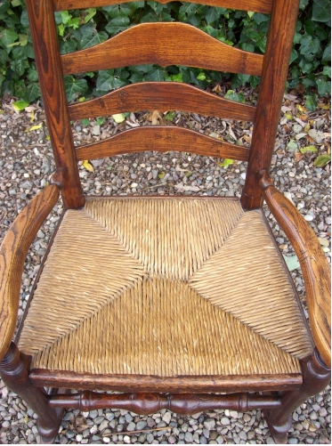 A superb early 1800's oak rocking chair with a high ladder back and comfortable rush seat. The seat measures a 1'3" from the ground and the chair only rocks slightly. The rush seat is in perfect condition and the chair is ready to be used and enjoyed.