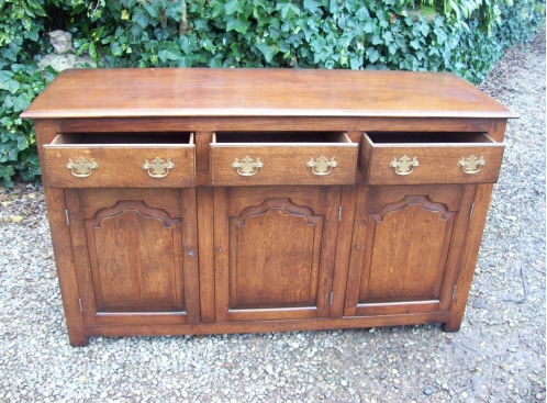 A George III style, 20th century oak dresser base with panelled sides and a rectangular moulded plank top above 3 frieze drawers and 3 panelled cupboard doors. The doors open to reveal a single shelf and ample storage space. All 3 doors have working locks which are operated by 2 keys. The whole is raised upon plain supports