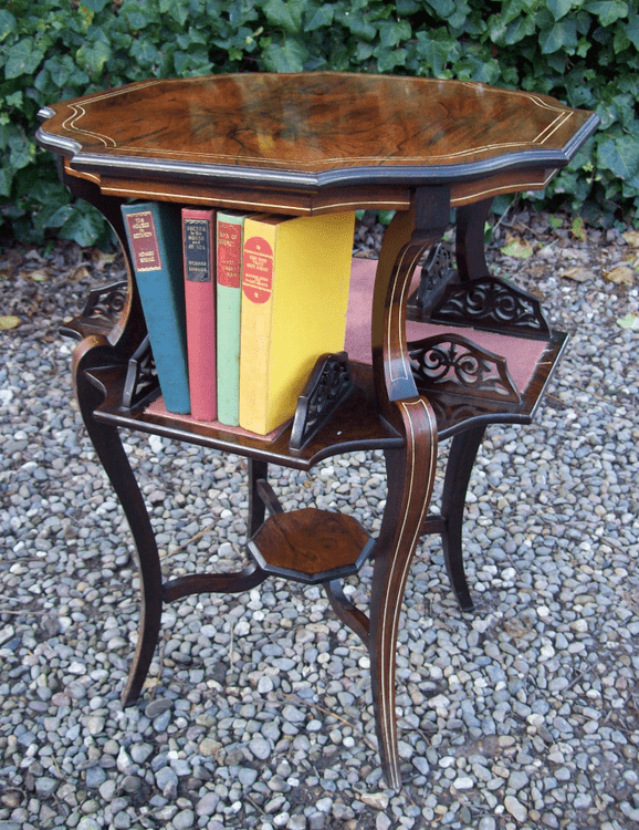 An Edwardian inlaid rosewood occasional table with a curvilinear moulded top inlaid with ivory line inlay. Raised upon four curvilinear legs joined by a shaped shelf which is ideal for holding books due to the fretwork acting as book ends. These can hold roughly four or five books measuring 7.5" tall. Below this is a undertier or vase stand.
