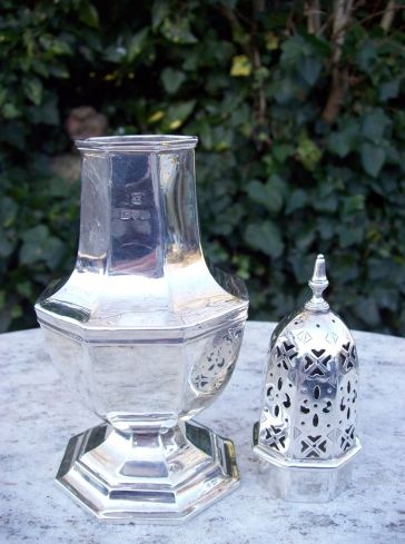 An English sterling silver sugar shaker hallmarked Chester 1918.