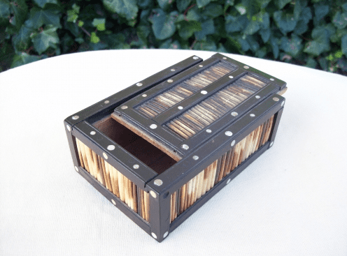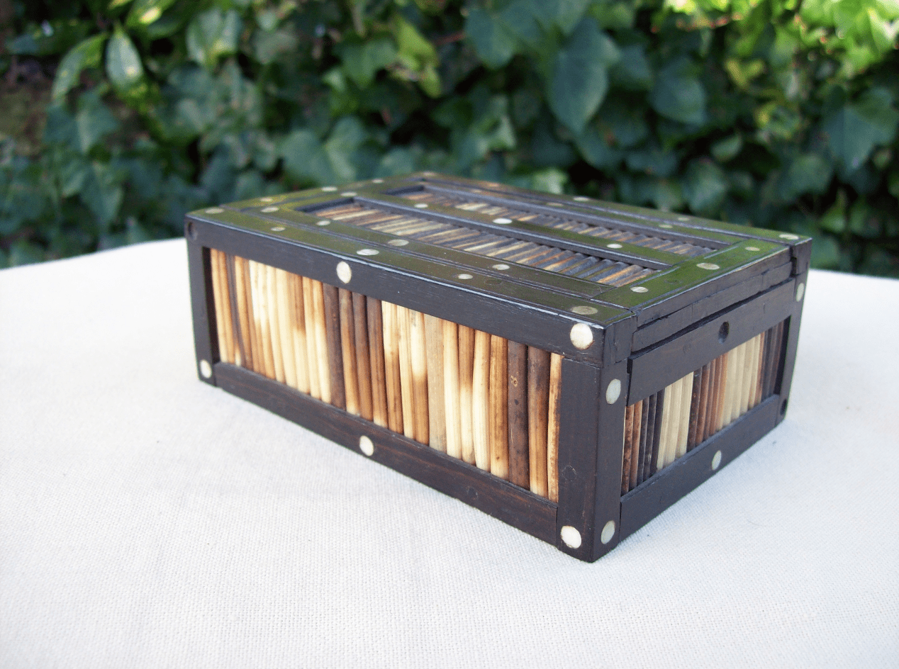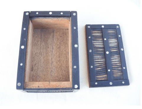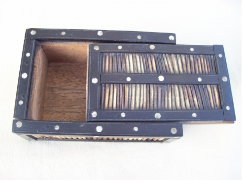An Indian porcupine box with sliding lid and inlaid bone discs to the ebony.