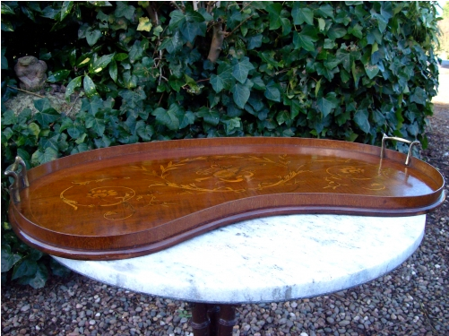 A Victorian walnut inlaid kidney shaped tray with handles.