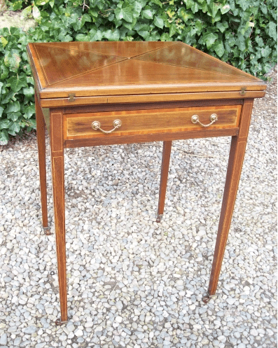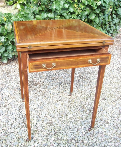 Here we have a mahogany Edwardian envelope card table. The top is in four triangular sections which open independently like an envelope, hence the name. Each triangular section is strung with boxwood and cross-banded, they open to reveal a green baize-lined playing surface which is in an excellent, clean condition. There are also four "guinea pits"or wells for holding money, chips and counters. There is a small, useful frieze drawer ideal for storing playing and score cards etc. The whole stands on four slender tapering legs terminating in original castors, which allows for easy movement.